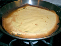 As I read the intro to Patricia's recipe, I learned she uses a custom made copper socca pan, about the same size as a paella pan. Light bulb! I have one, so I made a batch in our paella pan, which would have turned out good had there been more batter to make it slightly thicker and pancake-like. Edges crisped up nicely and it tasted OK, despite being too thin.