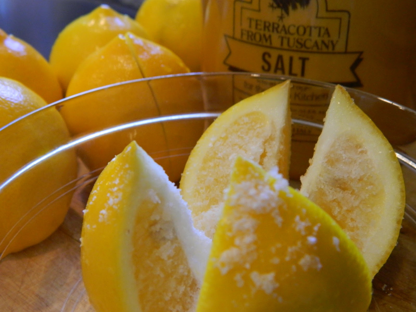 Several recipes suggest using olive oil to top-up the whole concoction which seem to get good reviews-- both for the flavor and protective value (the lemons won't be exposed to too much air as the olive oil kind of seals the space). So, I gave it a shot. A few tablespoons of olive oil was all it took. I sealed the containers and tilted the jars to let the juice roll around the lemons. It takes 3-4 weeks to cure and the lemons will shrivel up over time. Each day, flip the jar around and gently shake to let the brine distribute between the lemons. The jars do not have to be refrigerated- assuming you sterilized and sealed them properly. After a month or so, they are ready to be used. Cut off a slice and rinse off the salt. Most people only use the rind- and sparingly, as preserved lemons are very strong, both in flavor and aroma. They do not need to be refrigerated after opening and should keep in the pantry for several months.